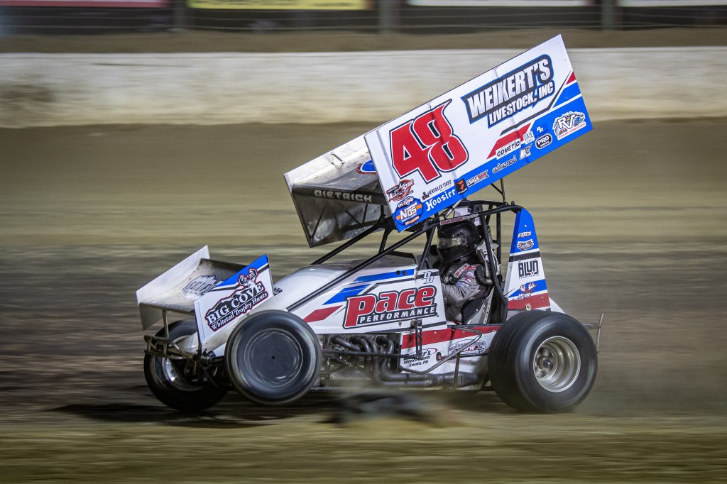 Ultimately, the main event proceeded without issue. Dietrich led all 25 laps, holding off a late charge by Parker Price-Miller to secure the win. Bowman, who had narrowly advanced out of the B-main by running the low line, changed his approach for the feature. Hugging the fence up top, he managed to pick up eight positions and earned the first All Star Circuit of Champions Hard Charger award of his relatively young sprint car career.
