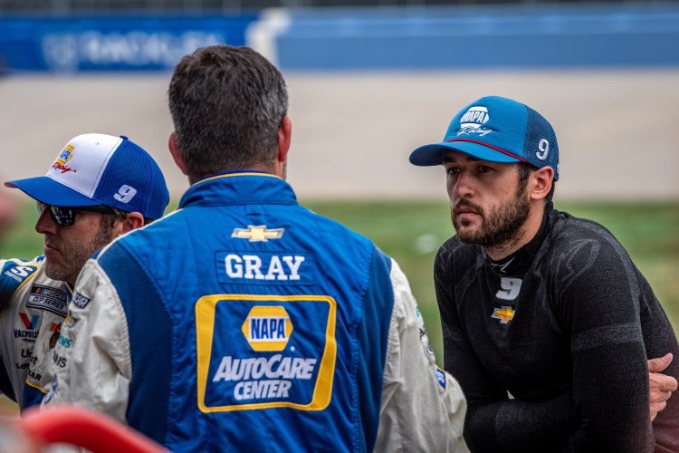 LEBANON, TENNESSEE – JUNE 26: Chase Elliott, driver of the #9 NAPA Auto Parts Chevrolet, talks with his pit crew during a weather delay in the NASCAR Cup Series Ally 400 at Nashville Superspeedway on June 26, 2022 in Lebanon, Tennessee.