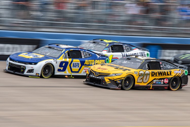 LEBANON, TENNESSEE – JUNE 26: Chase Elliott, driver of the #9 NAPA Auto Parts Chevrolet, Christopher Bell, driver of the #20 DeWalt Toyota, and William Byron, driver of the #24 Valvoline Chevrolet, race during the NASCAR Cup Series Ally 400 at Nashville Superspeedway on June 26, 2022 in Lebanon, Tennessee.