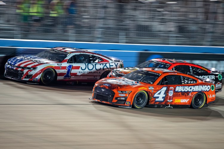 LEBANON, TENNESSEE – JUNE 26: Ross Chastain, driver of the #1 Jockey Chevrolet, Martin Truex Jr., driver of the #19 Bass Pro Shops Toyota, and Kevin Harvick, driver of the #4 Busch Light Apple Ford, race during the NASCAR Cup Series Ally 400 at Nashville Superspeedway on June 26, 2022 in Lebanon, Tennessee.