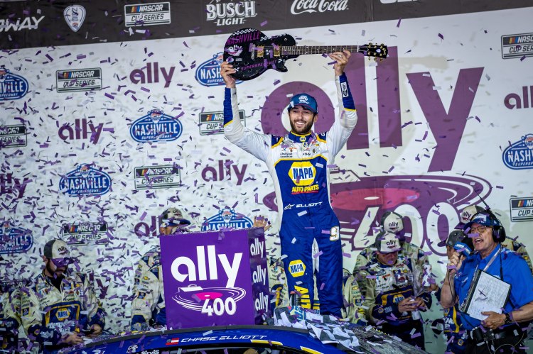 LEBANON, TENNESSEE – JUNE 26: Chase Elliott, driver of the #9 NAPA Auto Parts Chevrolet, celebrates in victory lane after winning the NASCAR Cup Series Ally 400 at Nashville Superspeedway on June 26, 2022 in Lebanon, Tennessee.