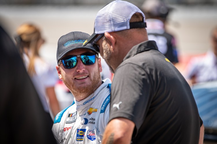 BROOKLYN, MICHIGAN – AUGUST 06: Austin Hill, driver of the #33 Bennett Transportation Chevrolet, chats on the grid during practice for the NASCAR Cup Series FireKeepers Casino 400 at Michigan International Speedway on August 06, 2022 in Brooklyn, Michigan.