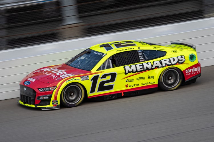 BROOKLYN, MICHIGAN – AUGUST 06: Ryan Blaney, driver of the #12 Menards/Cardell Cabinetry Ford, drives during practice for the NASCAR Cup Series FireKeepers Casino 400 at Michigan International Speedway on August 06, 2022 in Brooklyn, Michigan.