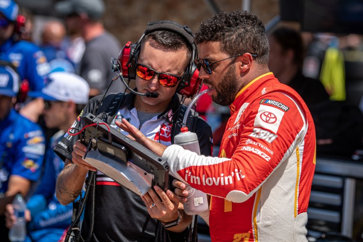 BROOKLYN, MICHIGAN – AUGUST 06: Bubba Wallace, driver of the #23 McDonald’s Toyota, and a crew member talk on the grid during qualifying for the NASCAR Cup Series FireKeepers Casino 400 at Michigan International Speedway on August 06, 2022 in Brooklyn, Michigan.