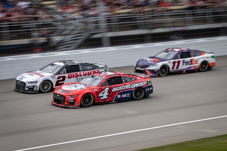 BROOKLYN, MICHIGAN – AUGUST 07: Kevin Harvick, driver of the #4 Busch Light Apple #BuschelOfBusch Ford, Austin Cindric, driver of the #2 Discount Tire Ford, and Denny Hamlin, driver of the #11 FedEx Freight Toyota, race during the NASCAR Cup Series FireKeepers Casino 400 at Michigan International Speedway on August 07, 2022 in Brooklyn, Michigan.