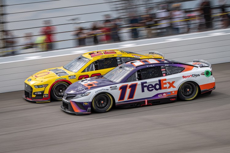 BROOKLYN, MICHIGAN – AUGUST 07: Denny Hamlin, driver of the #11 FedEx Freight Toyota, and Joey Logano, driver of the #22 Shell Pennzoil Ford, race during the NASCAR Cup Series FireKeepers Casino 400 at Michigan International Speedway on August 07, 2022 in Brooklyn, Michigan.