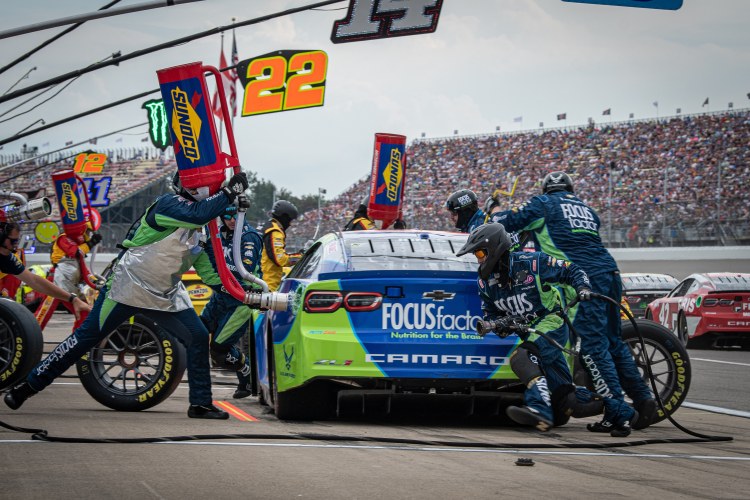 BROOKLYN, MICHIGAN – AUGUST 07: Erik Jones, driver of the #43 FOCUSfactor Chevrolet, pits during the NASCAR Cup Series FireKeepers Casino 400 at Michigan International Speedway on August 07, 2022 in Brooklyn, Michigan.