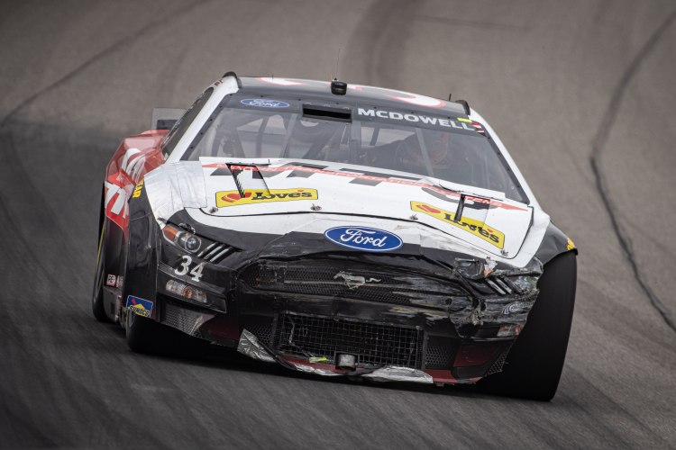 BROOKLYN, MICHIGAN – AUGUST 07: Michael McDowell, driver of the #34 Martin Transportation Systems Ford, drives a damaged car during the NASCAR Cup Series FireKeepers Casino 400 at Michigan International Speedway on August 07, 2022 in Brooklyn, Michigan.