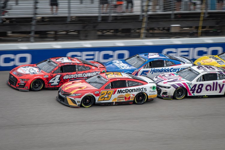 BROOKLYN, MICHIGAN – AUGUST 07: Bubba Wallace, driver of the #23 McDonald’s Toyota, Kevin Harvick, driver of the #4 Busch Light Apple #BuschelOfBusch Ford, Kyle Larson, driver of the #5 HendrickCars.com Chevrolet, and Alex Bowman, driver of the #48 Ally Chevrolet, race during the NASCAR Cup Series FireKeepers Casino 400 at Michigan International Speedway on August 07, 2022 in Brooklyn, Michigan.