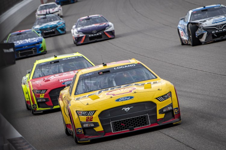 BROOKLYN, MICHIGAN – AUGUST 07: Joey Logano, driver of the #22 Shell Pennzoil Ford, leads a group of cars during the NASCAR Cup Series FireKeepers Casino 400 at Michigan International Speedway on August 07, 2022 in Brooklyn, Michigan.