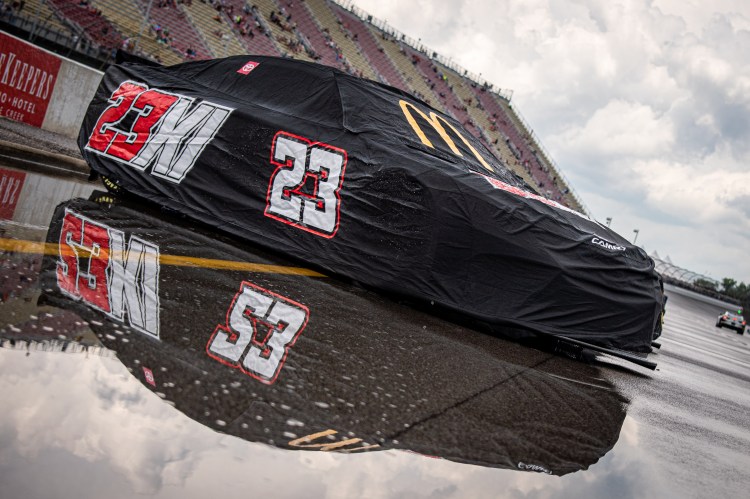 BROOKLYN, MICHIGAN – AUGUST 07: The #23 McDonald’s Toyota of Bubba Wallace sits on the starting grid during a rain delay prior to the NASCAR Cup Series FireKeepers Casino 400 at Michigan International Speedway on August 07, 2022 in Brooklyn, Michigan.