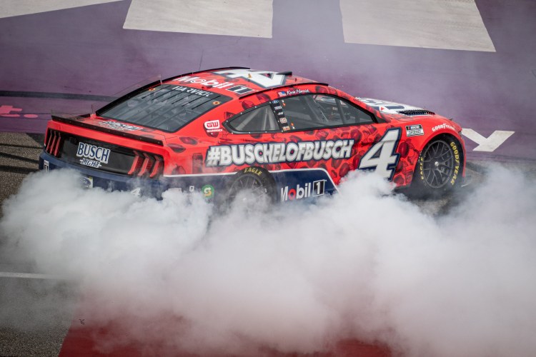 BROOKLYN, MICHIGAN – AUGUST 07: Kevin Harvick, driver of the #4 Busch Light Apple #BuschelOfBusch Ford, celebrates with a burnout after winning the NASCAR Cup Series FireKeepers Casino 400 at Michigan International Speedway on August 07, 2022 in Brooklyn, Michigan.