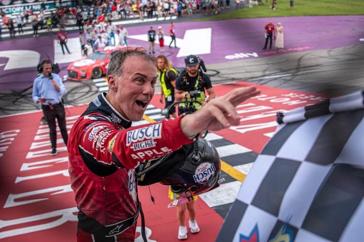 BROOKLYN, MICHIGAN – AUGUST 07: Kevin Harvick, driver of the #4 Busch Light Apple #BuschelOfBusch Ford, takes the checkered flag after winning the NASCAR Cup Series FireKeepers Casino 400 at Michigan International Speedway on August 07, 2022 in Brooklyn, Michigan.
