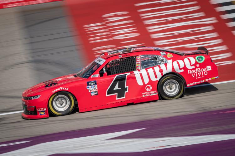 BROOKLYN, MICHIGAN – AUGUST 06: Bayley Currey, driver of the #4 Hy-Vee Chevrolet, sustains a flat rear tire during qualifying for the NASCAR Xfinity Series New Holland 250 at Michigan International Speedway on August 06, 2022 in Brooklyn, Michigan.