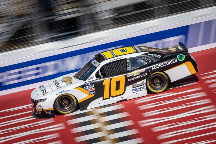 BROOKLYN, MICHIGAN – AUGUST 06: Landon Cassill, driver of the #10 Chevy Accessories Chevrolet, drives during qualifying for the NASCAR Xfinity Series New Holland 250 at Michigan International Speedway on August 06, 2022 in Brooklyn, Michigan.