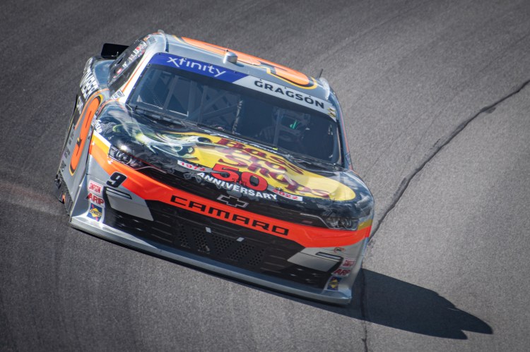 BROOKLYN, MICHIGAN – AUGUST 06: Noah Gragson, driver of the #9 Bass Pro Shops/TrueTimber/BRCC Chevrolet, races during the NASCAR Xfinity Series New Holland 250 at Michigan International Speedway on August 06, 2022 in Brooklyn, Michigan.