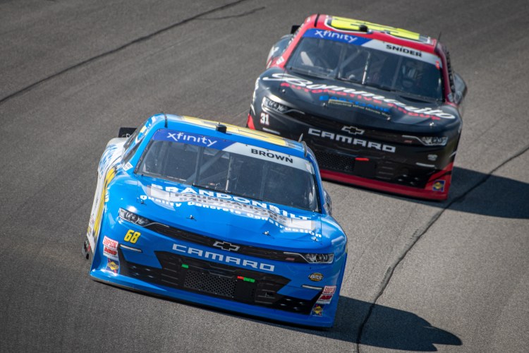 BROOKLYN, MICHIGAN – AUGUST 06: Brandon Brown, driver of the #68 Brandonbilt Foundations Chevrolet, and Myatt Snider, driver of the #31 Bommarito Automotive Group Chevrolet, race during the NASCAR Xfinity Series New Holland 250 at Michigan International Speedway on August 06, 2022 in Brooklyn, Michigan.