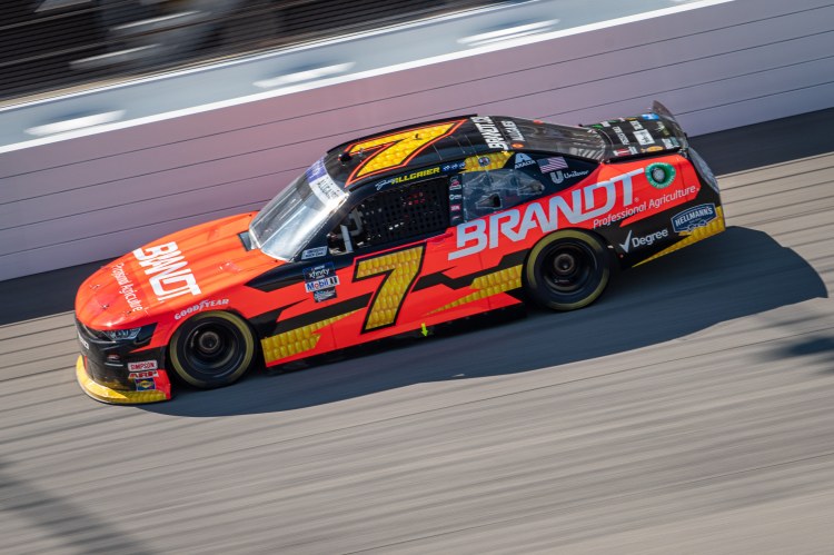 BROOKLYN, MICHIGAN – AUGUST 06: Justin Allgaier, driver of the #7 BRANDT Chevrolet, races during the NASCAR Xfinity Series New Holland 250 at Michigan International Speedway on August 06, 2022 in Brooklyn, Michigan.