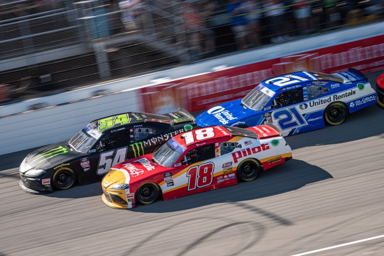 BROOKLYN, MICHIGAN – AUGUST 06: Ty Gibbs, driver of the #54 Monster Energy Toyota, Sammy Smith, driver of the #18 Pilot Flying J Toyota, and Austin Hill, driver of the #21 United Rentals Chevrolet, race during the NASCAR Xfinity Series New Holland 250 at Michigan International Speedway on August 06, 2022 in Brooklyn, Michigan.