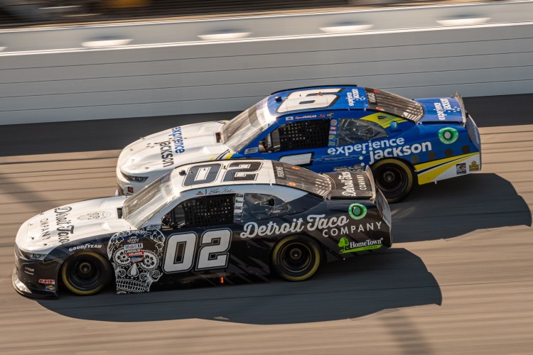 BROOKLYN, MICHIGAN – AUGUST 06: Ryan Vargas, driver of the #6 Experience Jackson Chevrolet, and Blaine Perkins, driver of the #02 Detroit Taco Company Chevrolet, race during the NASCAR Xfinity Series New Holland 250 at Michigan International Speedway on August 06, 2022 in Brooklyn, Michigan.