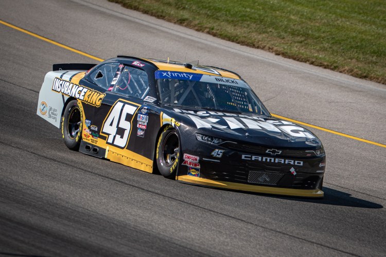 BROOKLYN, MICHIGAN – AUGUST 06: Josh Bilicki, driver of the #45 Insurance King Chevrolet, races during the NASCAR Xfinity Series New Holland 250 at Michigan International Speedway on August 06, 2022 in Brooklyn, Michigan.