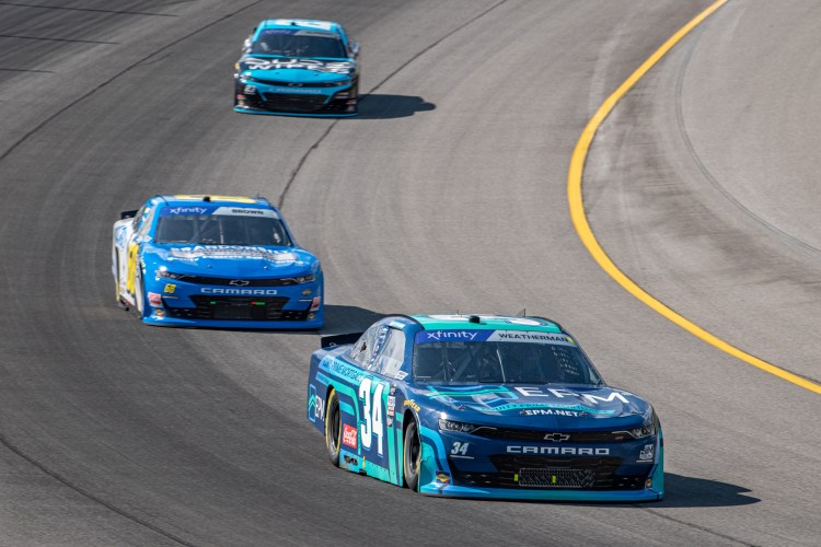 BROOKLYN, MICHIGAN – AUGUST 06: Kyle Weatherman, driver of the #34 Equity Prime Mortgage Chevrolet, Brandon Brown, driver of the #68 Brandonbilt Foundations Chevrolet, and Anthony Alfredo, driver of the #23 Dude Wipes Chevrolet, race during the NASCAR Xfinity Series New Holland 250 at Michigan International Speedway on August 06, 2022 in Brooklyn, Michigan.