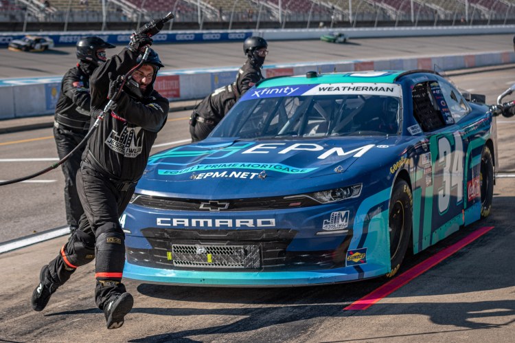 BROOKLYN, MICHIGAN – AUGUST 06: Kyle Weatherman, driver of the #34 Equity Prime Mortgage Chevrolet, pits during the NASCAR Xfinity Series New Holland 250 at Michigan International Speedway on August 06, 2022 in Brooklyn, Michigan.