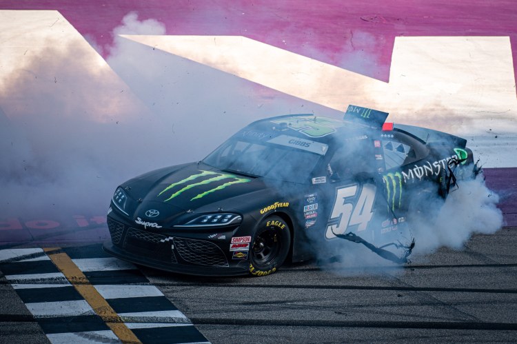 BROOKLYN, MICHIGAN – AUGUST 06: Ty Gibbs, driver of the #54 Monster Energy Toyota, celebrates with a burnout after winning the NASCAR Xfinity Series New Holland 250 at Michigan International Speedway on August 06, 2022 in Brooklyn, Michigan.