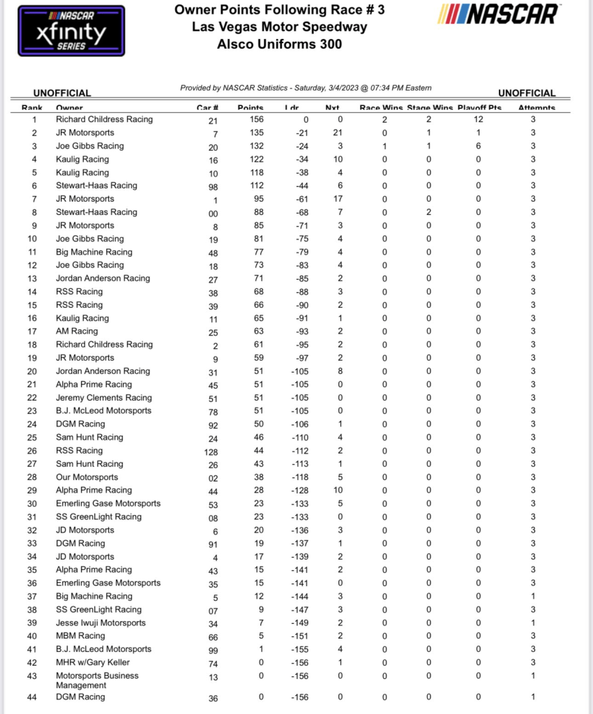 All told it was a fairly tame race, causing very little attrition with only one DNF (Joey Gase, mechanical issue). Parker Kligerman went for a spin early which prompted a caution, but did not receive any damage and rebounded for a solid p11 finish. Josh Berry and Rajah Caruth also went for damage-free spins of their own that both yielded cautions. Outside of that, it was an exceptionally clean race, with no cautions in the races final stage.