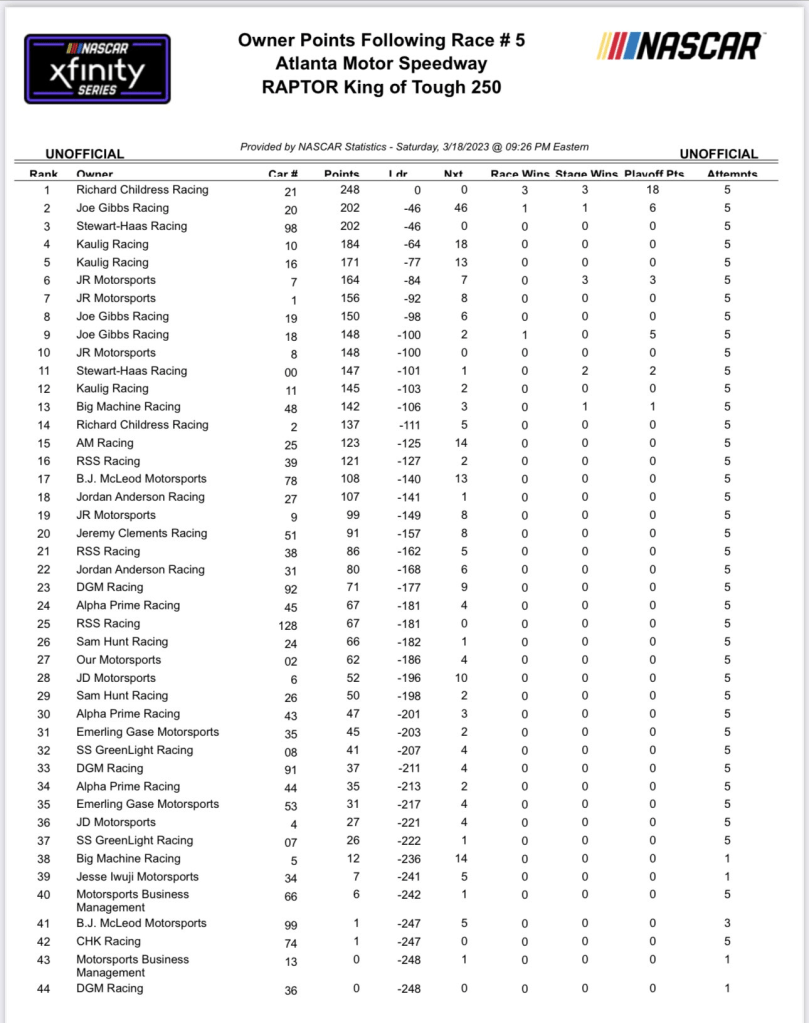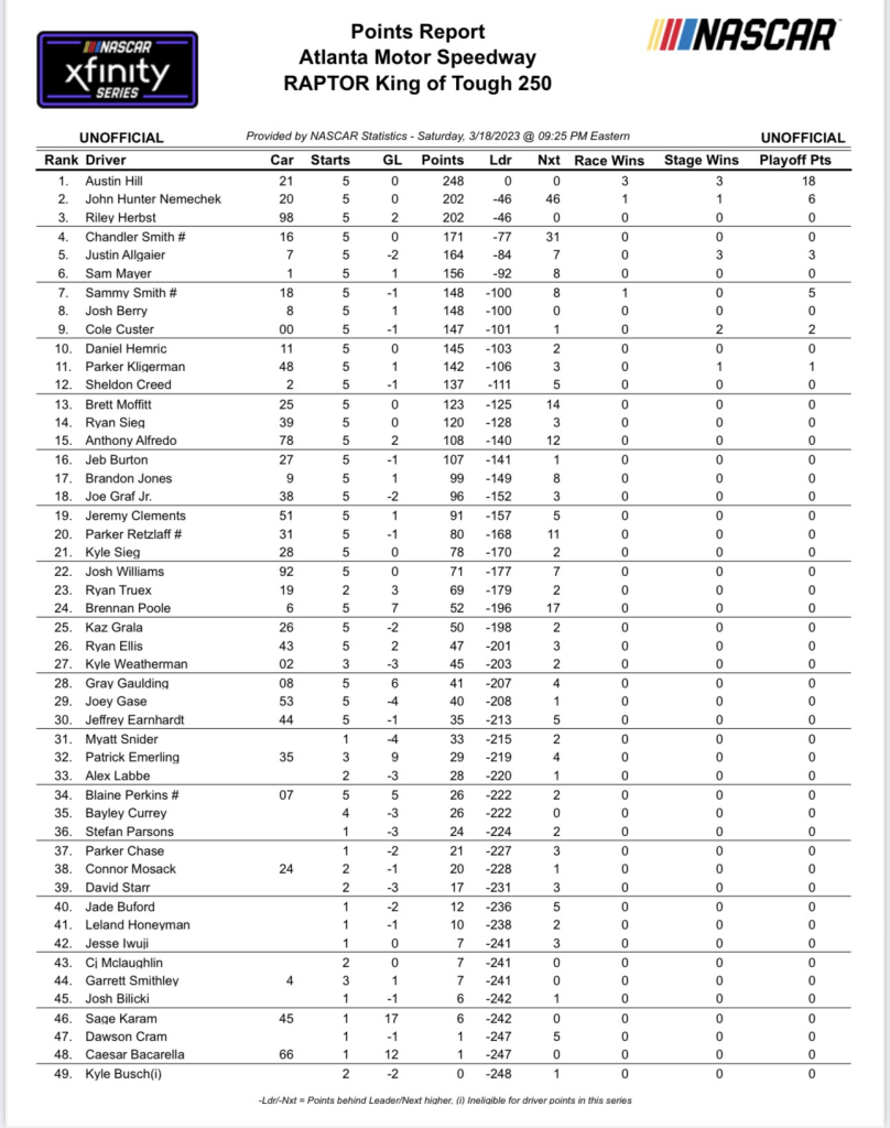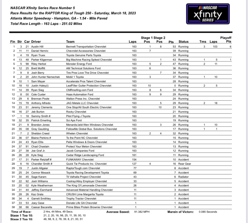 In the second leg of NASCAR’s Saturday doubleheader, the Raptor 250 at Atlanta Motor Speedway accomplished the same undesirable feat as the truck race earlier in the day, as it set the record for the most cautions in an Xfinity Series race at Atlanta with 11. It was a race of attrition as 12 cars failed to finish the race, and several others that did manage to cross the stripe did so with damage of one form or another.