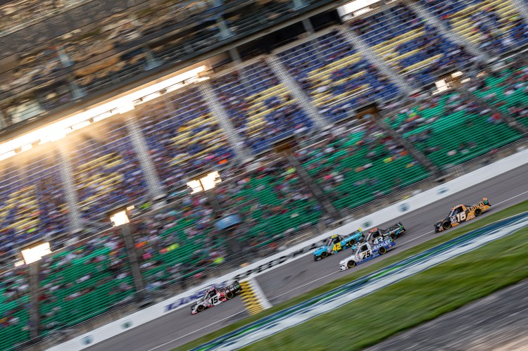 KANSAS CITY, KANSAS – MAY 06: Tanner Gray, driver of the #15 Mobil 1 Toyota, leads Carson Hocevar, driver of the #42 Worldwide Express Chevrolet, Daniel Dye, driver of the #43 Race to Stop Suicide Chevrolet, Matt DiBenedetto, driver of the #25 Rackley Roofing/WAR Shocks Chevrolet, and Tyler Ankrum, driver of the #16 LiUNA! Toyota, during the NASCAR Craftsman Truck Series Heart of America 200 at Kansas Speedway on May 06, 2023 in Kansas City, Kansas.