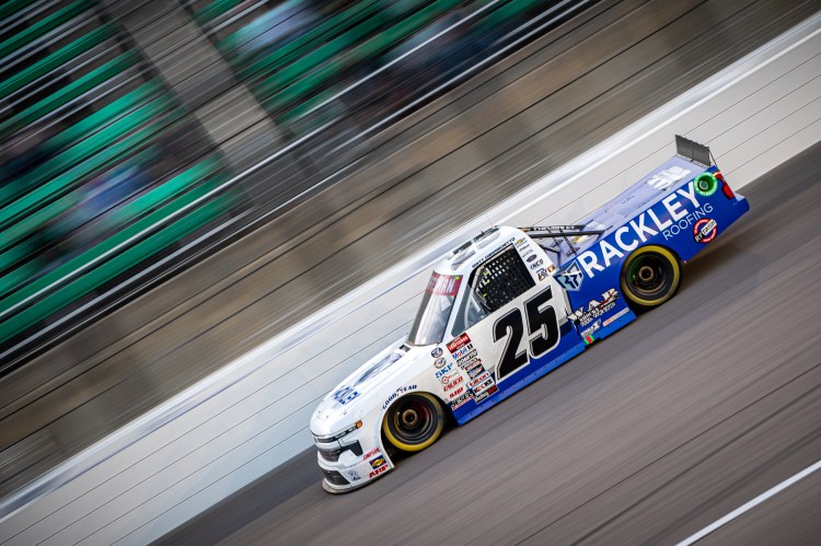 KANSAS CITY, KANSAS – MAY 06: Matt DiBenedetto, driver of the #25 Rackley Roofing/WAR Shocks Chevrolet, races during the NASCAR Craftsman Truck Series Heart of America 200 at Kansas Speedway on May 06, 2023 in Kansas City, Kansas.