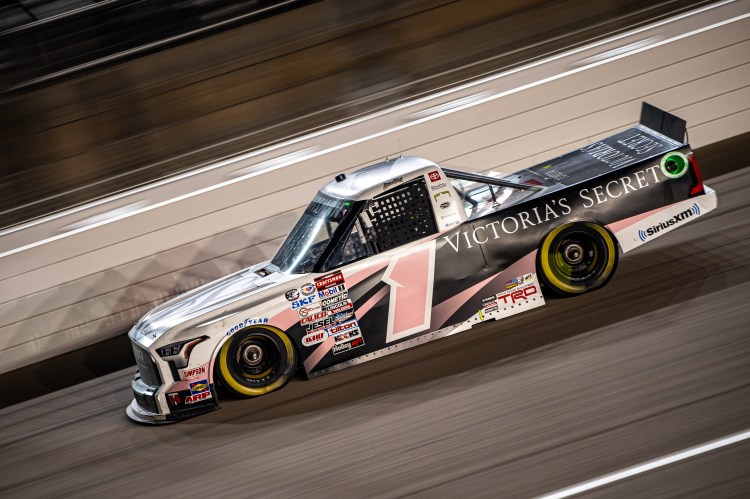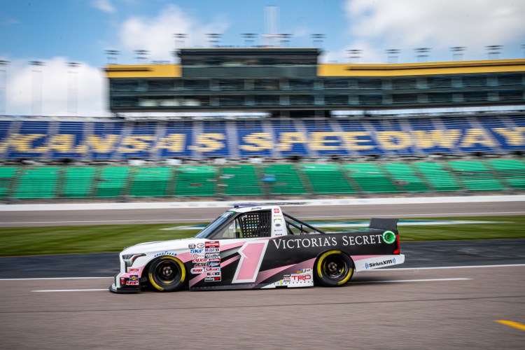 KANSAS CITY, KANSAS – MAY 06: Toni Breidinger, driver of the #1 Victoria’s Secret Toyota, races during the NASCAR Craftsman Truck Series Heart of America 200 at Kansas Speedway on May 06, 2023 in Kansas City, Kansas.