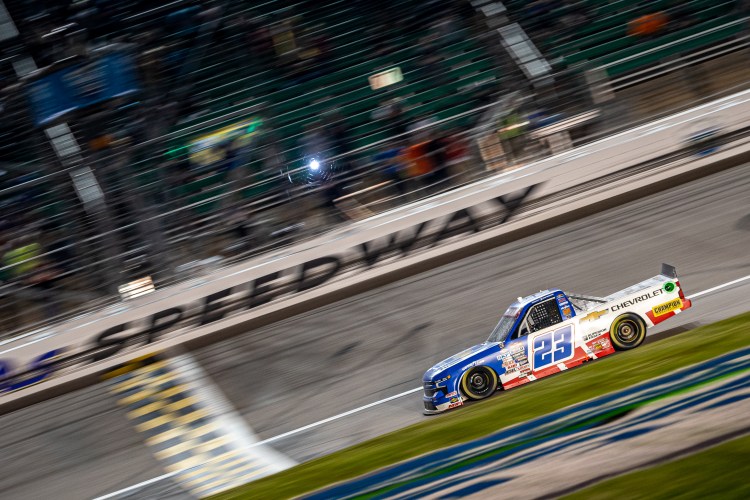 KANSAS CITY, KANSAS – MAY 06: Grant Enfinger, driver of the #23 Chevy Military Appreciation Chevrolet, takes the checkered flag to win the NASCAR Craftsman Truck Series Heart of America 200 at Kansas Speedway on May 06, 2023 in Kansas City, Kansas.