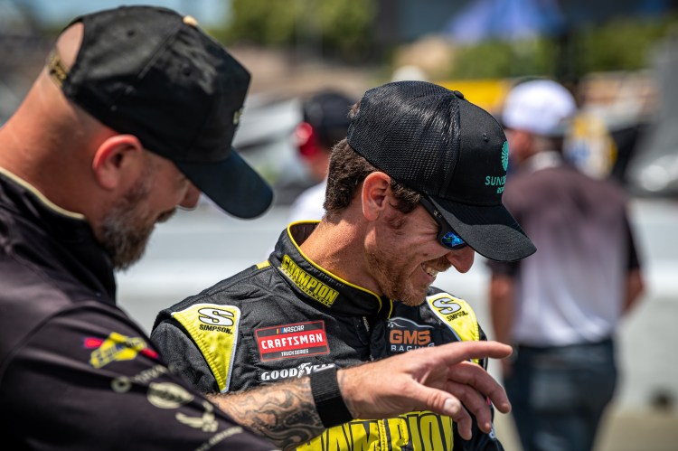 SONOMA, CALIFORNIA – JUNE 10: Grant Enfinger, driver of the #42 Sunseeker Resort Chevrolet, looks at his car and smiles before practice for the NASCAR Cup Series Toyota / Save Mart 350 at Sonoma Raceway on June 10, 2023 in Sonoma, California.