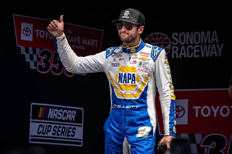 SONOMA, CALIFORNIA – JUNE 11:Chase Elliott, driver of the #9 NAPA Auto Parts Chevrolet, greets fans during driver intros prior to the NASCAR Cup Series Toyota / Save Mart 350 at Sonoma Raceway on June 11, 2023 in Sonoma, California.