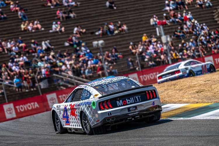 SONOMA, CALIFORNIA – JUNE 11: Kevin Harvick, driver of the #4 Mobil 1 Ford, and Chase Briscoe, driver of the #14 Ford Performance Racing School Ford, race during the NASCAR Cup Series Toyota / Save Mart 350 at Sonoma Raceway on June 11, 2023 in Sonoma, California.