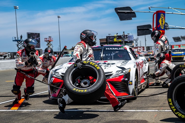 SONOMA, CALIFORNIA – JUNE 11: Denny Hamlin, driver of the #11 Sport Clips Haircuts Toyota, pits during the NASCAR Cup Series Toyota / Save Mart 350 at Sonoma Raceway on June 11, 2023 in Sonoma, California.