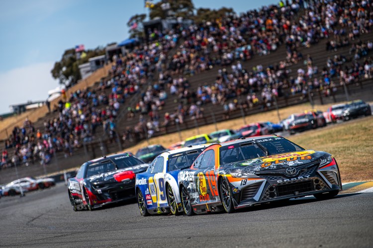 SONOMA, CALIFORNIA – JUNE 11: Martin Truex Jr., driver of the #19 Bass Pro Shops Toyota, leads the field during the NASCAR Cup Series Toyota / Save Mart 350 at Sonoma Raceway on June 11, 2023 in Sonoma, California.