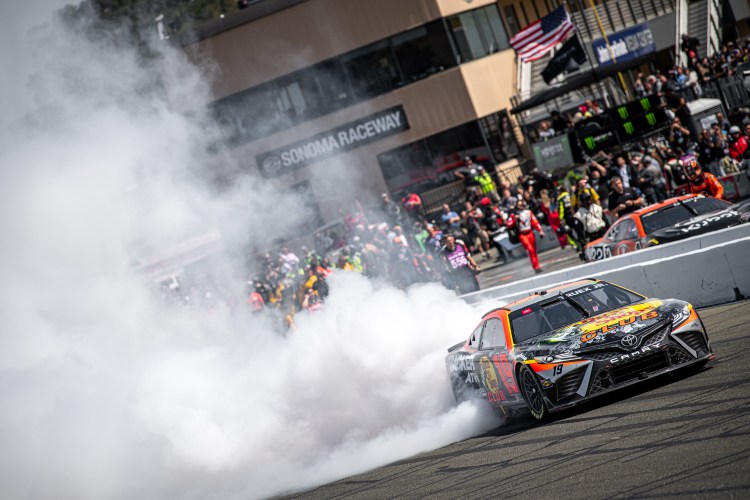 SONOMA, CALIFORNIA – JUNE 11: Martin Truex Jr., driver of the #19 Bass Pro Shops Toyota, celebrates with a burnout after winning the NASCAR Cup Series Toyota / Save Mart 350 at Sonoma Raceway on June 11, 2023 in Sonoma, California.
