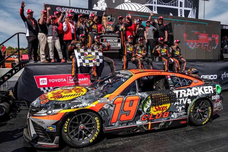 SONOMA, CALIFORNIA – JUNE 11: Martin Truex Jr., driver of the #19 Bass Pro Shops Toyota, and his crew celebrate in victory lane after winning the NASCAR Cup Series Toyota / Save Mart 350 at Sonoma Raceway on June 11, 2023 in Sonoma, California.