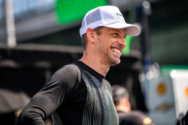 INDIANAPOLIS, INDIANA – AUGUST 12: Jenson Button, driver of the #15 Mobil 1 Ford, smiles before practice for the NASCAR Cup Series Verizon 200 at the Brickyard at Indianapolis Motor Speedway on August 12, 2023 in Indianapolis, Indiana.