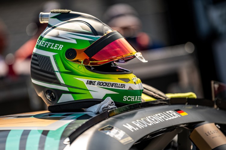INDIANAPOLIS, INDIANA – AUGUST 12: Detail view showing Mike Rockenfeller’s helmet resting on top of the #42 Sunseeker Resort Chevrolet before practice for the NASCAR Cup Series Verizon 200 at the Brickyard at Indianapolis Motor Speedway on August 12, 2023 in Indianapolis, Indiana.