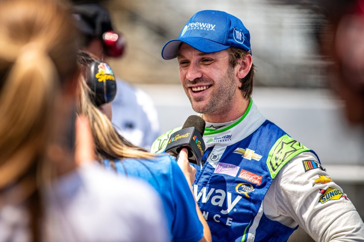 INDIANAPOLIS, INDIANA – AUGUST 12: Daniel Suarez, driver of the #99 Freeway.com Chevrolet, gives an interview after qualifying on the pole for the NASCAR Cup Series Verizon 200 at the Brickyard at Indianapolis Motor Speedway on August 12, 2023 in Indianapolis, Indiana.