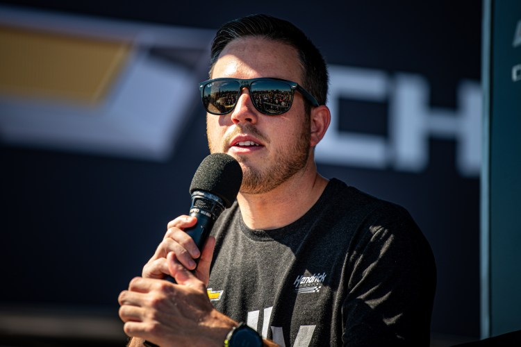 INDIANAPOLIS, INDIANA – AUGUST 13: Alex Bowman, driver of the #48 Ally Chevrolet, chats with fans prior to the NASCAR Cup Series Verizon 200 at the Brickyard at Indianapolis Motor Speedway on August 13, 2023 in Indianapolis, Indiana.
