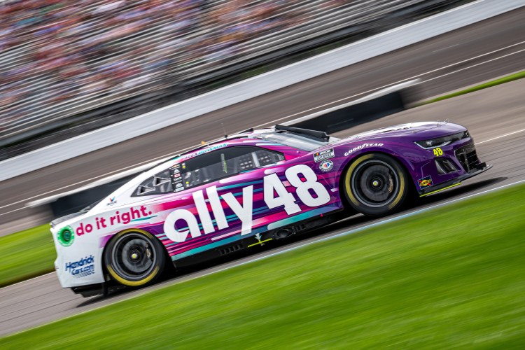 INDIANAPOLIS, INDIANA – AUGUST 13: Alex Bowman, driver of the #48 Ally Chevrolet, races during the NASCAR Cup Series Verizon 200 at the Brickyard at Indianapolis Motor Speedway on August 13, 2023 in Indianapolis, Indiana.