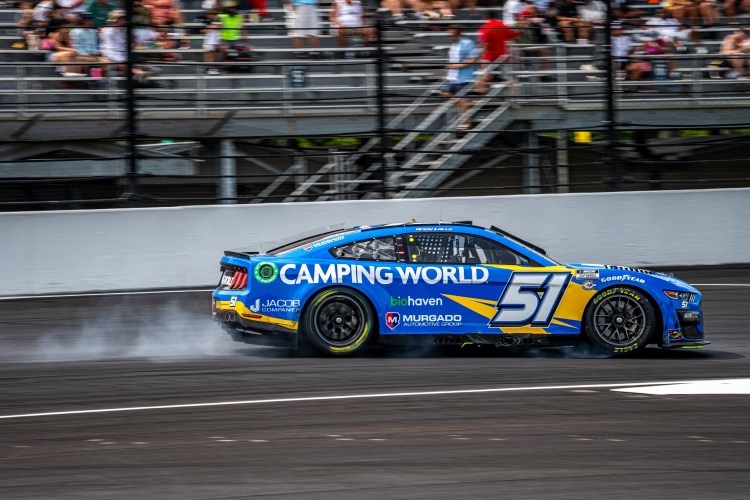 INDIANAPOLIS, INDIANA – AUGUST 13: Andy Lally, driver of the #51 Camping World Ford, races during the NASCAR Cup Series Verizon 200 at the Brickyard at Indianapolis Motor Speedway on August 13, 2023 in Indianapolis, Indiana.