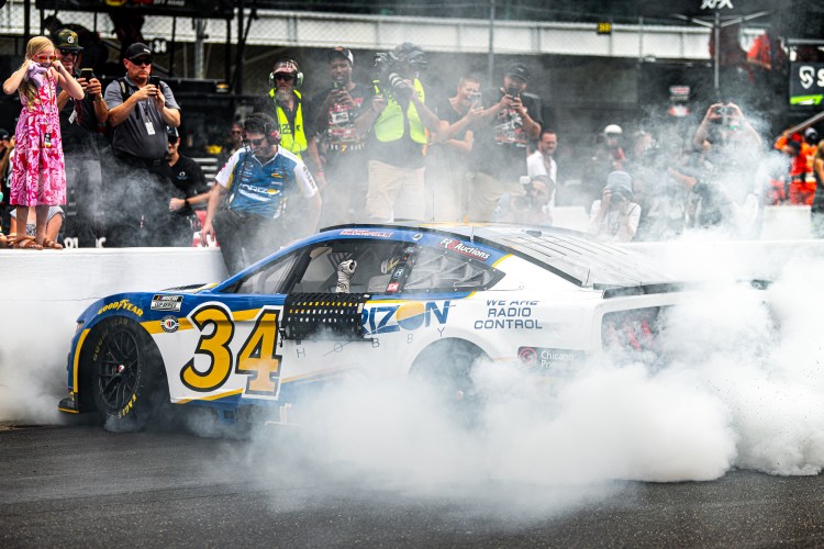 INDIANAPOLIS, INDIANA – AUGUST 13: Michael McDowell, driver of the #34 Horizon Hobby Ford, celebrates with a burnout after winning the NASCAR Cup Series Verizon 200 at the Brickyard at Indianapolis Motor Speedway on August 13, 2023 in Indianapolis, Indiana.