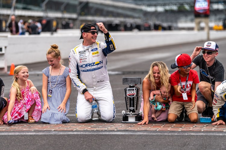 INDIANAPOLIS, INDIANA – AUGUST 13: Michael McDowell, driver of the #34 Horizon Hobby Ford, celebrates with his family after winning the NASCAR Cup Series Verizon 200 at the Brickyard at Indianapolis Motor Speedway on August 13, 2023 in Indianapolis, Indiana.