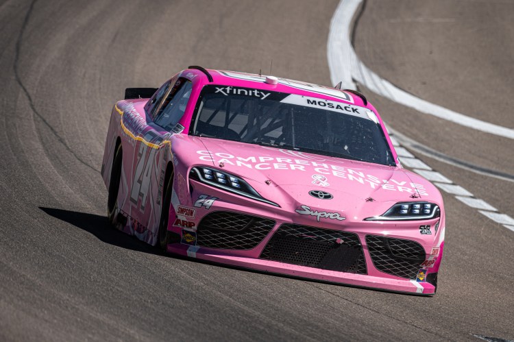 LAS VEGAS, NEVADA – OCTOBER 14: Connor Mosack, driver of the #24 Comprehensive Cancer Centers Toyota, races during the NASCAR Xfinity Series Alsco Uniforms 302 at Las Vegas Motor Speedway on October 14, 2023 in Las Vegas, Nevada.